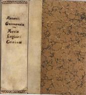 in 8°, pp. 10 nn., 530 leg. recente m/perg. con tit. manos. al ds. e piatti marmor. L'opera è composta di 5 parti: Prolegomena, de artis, logicocriticae natura origine & progressu. Libro I: De natura & operationibus mentis, Libro II: De ideis, idearumque