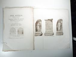 In 4, pp. 69 + (1b) con una tav. f.t. inc. all'acq. raff. alcune parti dell'antica ara, vignetta al fr. e bel finalino all'acq. raffigurante le vestigia dell'arco romano presso Carnunto, in Pannonia (attuale Austria), importante fortezza legionaria dell'impero romano. D. rifatto. Br. muta coeva. Saggio che descrive il ritrovamento fatto da Stefano Nobile De Mainoni, a Carnunto, di una base recante un'iscrizione con bassorilievo ai due lati. La scultura a sinistra rappresenta la dea Fortuna, una donna vesrita di tunica, peplo e manto che regge nella mano destra un timone sovrapposto col globo e con la sinistra una cornucopia. Dall'altro lato un giovane seminudo, incoronato di torri, con il corno dell'abbondanza fra le mani. Si tratta probabilmente del genio della stessa citta' di Carnunto.