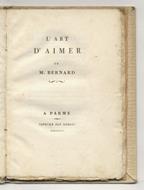 A Parme, Imprimé par Bodoni, 1798, in-8 piccolo, elegante cartonatura novecentesca bianco-crema con nervi in pelle passanti sui piatti e piccola figura in oro in rilievo al centro del piatto anteriore (Tritone che suona una conchiglia?), titolo in oro al dorso, pp. [4], 61, [3]. La prima e l'ultima carta bianche. Brooks, n. 706. Esemplare a pieni margini. Ottime condizioni.