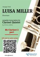 Bb Clarinet 2 part of "Luisa Miller" overture, complete transcription for Clarinet Quintet by Enrico Zullino ( Bb Clarinets 1-4 and Bb Bass Clarinet) advanced level. duration 6.00 min (+-). Score & Parts available in series. Scan Qr-code (in cover) for audio demo or visit www.glissato.it product code: EG0808. Luisa Miller is an opera in three acts by Giuseppe Verdi to an Italian libretto by Salvadore Cammarano, based on the play Kabale und Liebe (Intrigue and Love) by the German dramatist Friedrich von Schiller.Verdi's initial idea for a new opera – for which he had a contract going back over several years – was rejected by the Teatro San Carlo in Naples. He attempted to negotiate his way out of this obligation and, when that failed, Cammarano came up with the idea of adapting the Schiller play, with which Verdi was familiar. The process was set in motion, with Verdi still living and working on initial ideas from Paris, where he had been living for almost two years before moving back to his home town of Busseto in the summer of 1849. It was from there that he wrote the music and traveled to Naples for rehearsals. The first performance was given on 8 December 1849.This was Verdi's 15th opera and it is regarded as the beginning of the composer's "middle period"