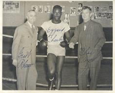 Fotografia originale del peso massimo americano Ezzard Charles (07.07.1921 - 28.05.1975), campione del mondo dal 1949 al 1951. Mm. 204x250. Anni '50 del '900. Il pugile è ritratto appoggiato alle corde del ring, ai suoi fianchi due persone (probabilmente suoi managers o organizzatori di pugilato). I nomi di tutti i personaggi ritratti sono manoscritti sulla fotografia. Timbro del fotografo al verso: Harold Stout 1416 Joseph Street Cincinnati 29, Ohio.