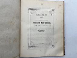 In 8 (cm 18 x 22,5), pp. 11 + (1 bianca). Brossura rifatta con carta d'epoca. Testo della dissertazione presentata da Stefano Bronda da Briga per il conseguimento della laurea in medicina e chirurgia presso l'Universita' di Torino nel 1852. La tesi ha per argomento l'aneurisma delle ossa. Alle pp. 8-11 presenti gli enunciati delle tesi nelle varie materie mediche estratte a sorte in italiano e latino (chirurgia teorico-pratica e operativa, medicina legale e tossicologia, ecc...).