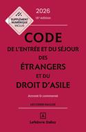 Les + de l'édition 2026 : - une sélection et une actualisation rigoureuse des annotations jurisprudentielles effectuée par un spécialiste de la matière; - des réponses adaptées aux questions qui préoccupent les praticiens du droit des étrangers; - commentaires pédagogiques et complets ; - Inclus : le Code en ligne, enrichi, annoté et mis à jour en continu. Le Code de l'entrée et du séjour des étrangers et du droit d'asile est à jour : du décret du 13 juin 2025 relatif aux cartes de séjour "talent" et modifiant certaines dispositions relatives aux cartes de séjour "recherche d'emploi-création d'entreprise" et "entrepreneur et profession libérale"; de l'arrêté du 21 mai 2025 fixant la liste des métiers et zones géographiques caractérisés par des difficultés de recrutement en application de l'article L. 414-13 du CESEDA; du décret du 5 mai 2025 sur la dématérialisation de l'information fournie sur la procédure de demande d'asile; de la loi du 30 avril 2025 portant diverses dispositions d'adaptation au droit de l'Union européenne en matière économique, financière, environnementale, énergétique, de transport, de santé et de circulation des personnes; du décret du 25 janvier 2025 relatif au comité interministériel de contrôle de l'immigration; du décret du 30 octobre 2024 modifiant les dispositions propres au certificat de nationalité dans le code de procédure civile. Ilintègre en outre : - des textes complémentaires rassemblés au sein d'un appendice (accords bilatéraux, règles relatives à la nationalité, dispositions pertinentes de la convention européenne de sauvegarde des droits de l'homme); - l'ensemble de cette réglementation est enrichie de bibliographies, d'annotations de jurisprudence et de commentaires explicatifs; - des tables de concordances permettent la navigation entre anciennes et nouvelles dispositions du code officiel.