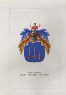 Lodi, Wilmant e figli, 1841-1848, in-4, privo di brossura, pp. [14]. Con due tavole f.t recanti altrettanti stemmi accuratamente miniati a mano all'epoca, in vividi colori, uno con particolari dorati. Fascicolo a fogli sciolti, dedicato alla storia della famiglia, tratto da Teatro araldico, ovvero Raccolta generale delle armi ed insegne gentilizie delle più illustri e nobili casate che esisterono un tempo e che tuttora fioriscono in tutta Italia di Leone Tettoni e F. Saladini, Lodi, Wilmant e figli, 1841-1848. Ottime condizioni.
