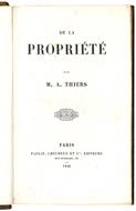 In 8vo (mm 220x137); pp. [4], 439, [1]. Lievi fioriture diffuse. Mezza pelle coeva con fregi e titolo in oro al dorso. Lievi spellature al dorso e ai piatti, ma nel complesso bella copia intonsa. PRIMA EDIZIONE di questa difesa dell'istituzione della proprietà, scritta quando il tema era al centro di una infuocata polemica tra i partiti della Rivoluzione e della Reazione. Il libro è diviso in quattro parti: la prima analizza e difende il diritto di proprietà, la seconda e la terza criticano le teorie comuniste e socialiste, mentre la quarta tratta della relazione tra proprietà e tassazione. Biblioteca Einaudi, 5585. Goldsmiths', 36120.
