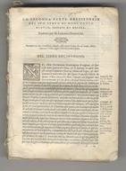 In Venetia, appresso Giorgio de' Cavalli, 1564, un volume in-4, legatura coeva in piena pergamena floscia, pp. 724. Modesto esemplare scompleto: solo secondo volume su tre, copertura della legatura staccata, fascicoli sciolti, manca il primo fascicolo [croce]4 e gli ultimi quattro fascicoli (a-d⁴), tracce di tarlo perlopiù marginali (raramente coinvolgono lo specchio di stampa) all'ultimo terzo del volume.
