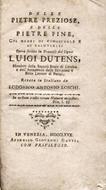 In-12° (cm 11x18.5) in leggera cartonatura coeva muta alla rustica con alette. Pp XXIV, 120, testo stampato sotto doppio filetto tipografico, fregi e finalini silografici. Interessanti note di antica amano alle sguardie. Modesti segni del tempo e d'uso ai piatti, dorso rinforzato internamente, interno fresco, buon esemplare in barbe. Prima edizione italiana di questo importante studio sulle pietre preziose recata nella nostra lingua dall'erudito, filosofo e instancabile traduttore modenese Lodovico Antonio Loschi (1744-1810), la cui prima opera poetica curiosamente si intitola Gemme poetiche. Il lavoro dello storico, traduttore e cultore di scienze naturali Louis Dutens (1730-1812) , apparso per la prima volta nel 1776 godette di notevole successo e venne tradotto in diverse lingue; basandosi sull'esperienza personale e sulla conoscenza delle maggiori collezioni europee dell'autore l'opera rappresenta una nomenclatura, tra le più complete e precise del suo tempo, sulle pietre preziose (diamanti, rubini, zaffiri, topazi) e sulle pietre fine (sassi di rocca opachi: diaspri e porfidi; e trasparenti: agata, corniolo, sardonia, etc. ) - presente l'interessante tavola coi prezzi dei diamanti tagliati. Dedicatoria a stampa di Giovanni Cioni a Gasparo Gherardini Marchese di Bazzano cui è dedicato anche un sonetto di Giambatista Vicini (p. IX),