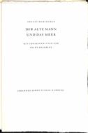 In 8 (cm 17 x 25,5), pp. (4 bianche) + 160 + (4). Cartella in brossura a fascicoli sciolti. Otto illustrazione xilografiche di Frans Masereel. Edizione di 550 esemplari numerati (ns copia no 78) con firma autografa a matita al colophon dell'illustratore. Elegante edizione tedesca di Il vecchio e il mare corredata di legni di Masereel. Non presente la data di stampa (ma 1961 o 1962).