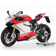 Kit statico in scatola di montaggio della Ducati 1199 Panigale S Tricolore, prodotto dalla Tamiya in scala 1:12. Come suggerisce il nome Tricolore è la versione della Ducati 1199 Panigale celebrativa del 150° anniversario dell'unificazione d'Italia. Al di là della colorazione della livrea, il modello ripropone la maggior parte del design rivoluzionario della Ducati 1199 Panigale S tradizionale, incluso il motore bicilindrico ad L da 1. 198cc integrato nel telaio monoscocca e collegato direttamente al braccio oscillante. Le forme distintive della Ducati sono accuratamente riprodotte Le carenature laterali sono fissati con piccole viti e possono essere rimosse anche dopo il montaggio Sospensione a molla elicoidale in metallo sul lato sinistro della moto Disegno del battistrada fedelmente raffigurato Fornita con cavalletto posteriore porta moto Decalcomanie incluse nella confezione, non colla e vernici Dettagliate istruzioni illustrate per l'assemblaggio del modello Compatibile con l'articolo Tamiya 12657, il Set Forcella Anteriore per Ducati 1199 Panigale S.