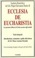 La centralità dell'Eucaristia nella vita della Chiesa, la necessità di riscoprire la celebrazione eucaristica come dono e mistero e non come semplice incontro conviviale, il rispetto e la venerazione per il pane consacrato, fonte di vita per tutti gli uomini, il ruolo fondamentale del sacerdote nella consacrazione del pane e del vino. Questi e altri i temi affrontati da Giovanni Paolo II nell'enciclica qui proposta nel testo integrale, con introduzione, commento e guida alla lettura di S.E. Mons. Luciano Pacomio. Il volume contiene inoltre un'antologia di pagine sulla pace del Santo Padre.