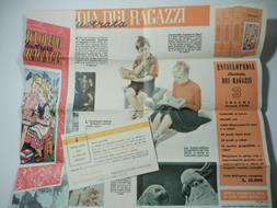Foglio pubblicitario ripiegato (aperto misura cm 47 x 33,5 circa) con illustrazioni. Pubblicita' dell'Enciclopedia dei ragazzi illustrata con carolina allegata con cedola di acquisto.
