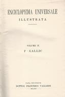 Volume IX F-GALLIC dell'opera "Enciclopedia Universale illustrata". La copertina, in simil pelle marrone rigida con titoli e fregi oro al dorso, presenta segni di usura ai margini da segnalare parziale mancanza del dorso e scotch carta alla cerniera del piatto posteriore. Pagine leggermente ingiallite dal tempo con occasionali illustrazioni in banco e nero.