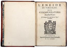 <p>In 4to (mm. 199x138). Pp. [6], 556, [4]. Segnatura: &pi;<sup>4</sup>A-Z<sup>8</sup> AA-LL<sup>8</sup> MM<sup>6</sup>&dagger;<sup>2</sup>. Manca la carta bianca &pi;4. Marca tipografica al frontespizio contenente lo stemma Medici-Cappello (esistono esemplari con il titolo ricomposto recante al centro lo stemma del dedicatario cardinale Alessandro Farnese). <em>Errata corrige</em> alle carte &dagger;1 e &dagger;2. Legatura di fine Settecento in mezzo marocchino rosso con punte, dorso a cinque nervi con fregi in oro, tassello in marocchino verde e titolo in oro, piatti ricoperti di carta rossa, risguardi marmorizzati. Etichetta della Libreria Mediolanum sul contropiatto anteriore; nota manoscritto al verso del risguardo anteriore &ldquo;1803&rdquo; e pi&ugrave; sotto &ldquo;144&rdquo;; altra nota &ldquo;5 tt&rdquo; al risguardo posteriore. Piccoli restauri all'angolo superiore esterno del frontespizio e alle ultime due carte, a tratti lievemente brunito e fiorito, ma nel complesso esemplare fresco e genuino.</p> <p>PRIMA EDIZIONE, uscita postuma per le cure del nipote dell'autore Lepido Caro, che firma anche l'epistola dedicatoria al cardinale Alessandro Farnese in data Roma, 4 febbraio 1581, di questa celebre traduzione italiana in endecasillabi sciolti dell'<em>Eneide</em> di Virgilio. Il manoscritto del volgarizzamento era stato inviato a Venezia per la stampa gi&agrave; nel 1576, ma la peste ne ritard&ograve; la pubblicazione per alcuni anni. Nel frattempo il nipote Giovanni Battista venne a morte e tocc&ograve; all'altro nipote Lepido di riprendere le trattative con gli editori ed ottenere che l'opera dello zio vedesse finalmente la luce.</p> <p>Annibal Caro, originario di Civitanova Marche, studi&ograve; a Firenze, dove conobbe Benedetto Varchi. Entrato successivamente al servizio dei