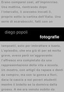 Ho conosciuto Diego in viaggio, su un treno di rientro dal Salone del libro di Torino ed ho proseguito con un viaggio "emozionale", leggendo il suo libro Fotografie. Le "fotografie" che scrive Diego sono momenti di vita narrati con una tecnica diretta e immediata, che riesce a creare nella fantasia del lettore le immagini di quei momenti. Percorriamo con lui episodi di vita quotidiana del passato e viviamo le emozioni del protagonista, in una gamma completa dal dolore alla gioia, descritte, però, sempre con un pizzico di nostalgia per quello che è stato. I fatti narrati sono episodi di tutti i giorni, in cui è possibile riconoscersi, ma sia per questo sia per la tecnica narrativa utilizzata, che predilige l'azione alla descrizione, diventano importanti al pari di eventi eccezionali. Che dire Diego, bravo! Una piacevolissima lettura che consiglio a tutti e l'augurio che tu trovi il tempo per scrivere il prossimo prima possibile!