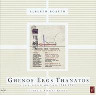 Il 15 novembre 1974, alla bolognese Galleria de' Foscherari, s'inaugura la mostra "Ghenos Eros Thanatos". Il curatore, Alberto Boatto, è uno dei più originali critici d'arte italiani. Tredici artisti (da Alighiero Boetti a Gino De Dominicis, da Giosetta Fioroni a Jannis Kounellis) sono raccolti, fra la nascita e la morte, dalla "forza che tenta di far legamento fra i due estremi": l'erotismo. Psicoanalisi, antropologia, cultura del "negativo" sono gli strumenti di questo "richiamo al represso, a quanto è vietato perché non allineato col presente e ne rappresenta il male". In occasione della mostra esce un libro che è, e non è, il suo catalogo: un "libro-mappa", "un periplo attorno alle situazioni limite della vita", "culmini cavi" della nostra esistenza. È il libro nero dell'arte italiana: messale sulfureo dei suoi riti più segreti e perturbanti. Come scrive Stefano Chiodi, "né saggio critico, né scritto teorico, né testo letterario, o meglio tutte queste cose assieme", Ghenos Eros Thanatos nega e insieme porta all'estremo, forse, la vicarietà e insieme il vampirismo dello scrivere sull'arte (nonché della critica in generale).