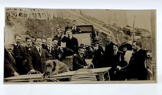 Fotografia originale cm 16,8 x 8,4 ai sali d'argento. Al verso, a penna, compare la lunga dicitura: Giornalisti genovesi di quarant'anni fa: Guido Gozzano e' seduto sul cofano della macchina (una delle prime automobili di piazza). Il pittore Grifo col Pizzo - Zoe Tomellini - Angiolini - Pastore - Steno - Costa - Gozzano - Becherucci - De Paoli - La Valle. In alto Rota. Gozzano ebbe occasione di frequentare Genova in diverse occasioni, a partire dall'infanzia, risiedette a Sturla, Pegli, e, in seguito alla 'Marinetta', presso il forte di San Giuliano, in S. Francesco D'Albaro, luogo dove e' stata scattata questa fotografia nella quale si vede il poeta torinese in compagnia di un bel gruppo di intellettuali genovesi, tra questi lo scultore Eugenio Baroni, la scrittrice Flavia Steno, il poeta Giuseppe De Paoli, l'amico Giacomo Garrone (anch'egli affetto da tisi e che partira' con lui per l'India) ecc. Lo scatto, simile ad altro conosciuto e pubblicato in Giulio Ottonelli, Vecchia Genova (che si differenzia per diverse posizioni dei personaggi ritratti), risale al 1912 e a uno dei momenti conviviali passati da Gozzano in compagnia dei molti amici artisti che ebbe modo di frequentare durante le sue vacanze nella citta' ligure. In particolare, proprio parlando di questo albergo, Gozzano, in una lettera a Vallini, lo definisce '...una bicocca d'estate e piu' bicocca d'inverno, col vento marino che la investe da tutte le parti, le finestre che non chiudono... ma oramai mi sono fatto di casa... e sono felice...' e proprio qui matureranno importanti componimenti come 'Convalescente', 'Nell'abbazia di S. Giuliano', 'La via del rifugio' ecc. Documento di particolare interesse che narra plasticamente i molti rapporti che il poeta torinese ebbe con il mondo intellettuale genovese e che, come ricordato da Marino Moretti '...si mescolava a un gruppo di amici che gli era fido non meno di quel di Torino...'. Cardinale, La frequentazione genovese di Gozzano, Vallini e Gianelli, I
