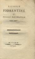 Milano, s.n.t., 1797, voll. 2 (su 3), in-12, cartoncino giallo coevo, pp. (2), 372, 233, (1). Firma d'appartenenza (Filippo Viganò) alla cop. ant. Tomi VI e VII delle "Opere di Niccolò Macchiavelli". Manca il vol. V, contenente i primi tre libri delle "Istorie".