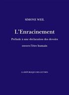 À Londres en 1943, alors qu'elle travaille au Commissariat à l'Intérieur de la France libre, Simone Weil rédige sur commande du général de Gaulle, un "Prélude à une déclaration des devoirs envers l'être humain", essai qui prendra le titre d'"Enracinement" lors de sa publication à titre posthume par Albert Camus en 1950. Composé en trois parties: "Les besoins de l'âme", "Le Déracinement" et "L'Enracinement", Simone Weil y poursuit le travail commencé dans ses "Réflexions sur les causes de la liberté et de l'oppression sociale", mais traite ici plus spécifiquement des devoirs envers l'être humain et non plus envers le groupe social des travailleurs opprimés. L'homme, affirme-elle, s'est "déraciné" des lois de la nature par sa conquête de la terre et par sa soumission à l'idée de progrès. Il lui faut maintenant poser des devoirs envers lui-même. Sur un autre plan de pensée, plus politique et concernant le déracinement du peuple français, son principal souci demeure le maintien de la souveraineté nationale au sein de l'Etat. Mais pour elle, la nation doit être un ensemble liant forces naturelles et forces spirituelles, entre autres par le travail. En réinscrivant l'homme dans une réalité non séparée de la volonté de Dieu, le travail signifie un consentement au monde et rend sa responsabilité à l'homme. Plus qu'un levier dans la vie sociale, il en devient le centre spirituel.