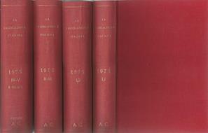 Annata completa edita nell'anno 1975 relativa alla Legislazione Italiana a cura di D. Marchetti e diretta da M. Fragali, in buono stato di conservazione. I quattro volumi sono rilegati in elegante cartonato porpora con titolo in oro al dorso. Le coperte mostrano segni di usura, ma sono integre così come anche i dorsi seppur con tracce di polvere e macchioline da contatto. Tagli bruniti esattamente come le pagine interne, a tratti mal rifilate, che si presentano con un ingiallimento velato ma con testo perfettamente integro e pulito. L'opera si compone di una prima parte di argomentazione contenuta nei primi due volumi, un terzo volume che contiene la seconda e terza parte mentre l'ultimo la quarta e quinta parte insieme corredate di indici. Alla redazione dei volumi hanno collaborato M. Cordella, L. Fragali, e G. Giannella. Numero pagine complessivo oltre 3000.