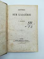 In 16 (cm 11,5 x 17,5), pp. XLI + (1) + 312 + (2). Bruniture alle pagine. Sigla manoscritta al frontespizio. Legatura coeva in mezza tela. Edizione originale non datata, ma pubblicata nel 1847. "Les Lettres sur l'Algerie publiees en 1847 par Xavier Marmier a la suite d'un voyage officiel du ministre de Salvandy dans la colonie, voyage auquel Marmier avait ete' invite' a prendre part. On trouve' la' une essez bonne description du pays, d'Alger notamment qu'il voit comme un immense campement, refuge d'une quantite' de diverses tribus , vivifie' par toutes sortes d'industries et retentissant de tous les bruits de la guerre..." (Dupuy, L'Algerie dans les lettres d'expression francaise, 1956, p. 58)