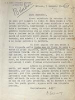 Lettera dattiloscritta, con firma autografa, su carta intestata "S.A. Aldo Garzanti Editore", stesa una facciata, indirizzata al prof. Giuseppe Maranini, ma riguardante un libro della moglie, Elda Bossi. Datata: Milano, 9 gennaio 1941 XIX. "Caro Mara