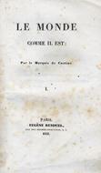 Paris, Eugène Renduel, 1835, voll. 2, in-8, br. edit., pp. 360, 438. Microfenditure al dorso del vol. I, minime mancanze ai dorsi di ambedue i volumi, qualche fioritura. Ex libris comitis Revedin. Apprezzato anche da Balzac, ma più conosciuto per i suoi libri di viaggi, fece scandalo per la nota omosessualità.