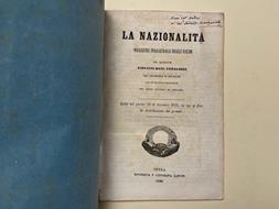 In 8 (cm 15,5 x 23), pp. 16 + foglietto di errata finale. Annotazione di ex dono al frontespizio. Brossura rifatta con carta d'epoca. Discorso tenuto da Giovanni Battista Tamagnone, professore di religione, poi di filosofia, nel Regio Collegio di Pallanza in occasione della distribuzione dei premi agli alunni del Collegio.