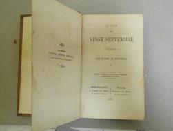 LA NUIT DU VINGT SEPTEMBRE Vol. 3 (L'IDIOT) - Edition autorisèe pour la Belgique et l'Etranger interdite pour la France .BRUXELLES ET LEIPZIG, A. SCHNEE ET COMP.ie, 1857. 1^ edizione - disponibile solo il 3. vol. (l'Idiot) - in 12. (cm. 10 x 155) - leg. in 1/2 pelle "coeva" - pp. (2) + 237 + (2) - una gora di umidità all'ultima bianca - ottimo nel resto