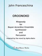 Commissioned as a competition entry by "Sam" Falcetti for the Springfield Accordion Orchestra in 1985, Oroonoko: Rhapsody for Bayan Accordion Ensemble has been performed by virtuoso accordion ensembles in concerts and musical competitions around the world. Inspired by the 1688 novel, Oroonoko, by British author Aphra Behn, the composition evokes the narrative of the eponymous African prince who, having been tricked into slavery, suffers many hardships but ultimately finds redemption in love, honor, and death. Divided into three connected movements, depicting Oroonoko's heroism in battle, his subsequent enslavement with the woman he loves, and the rebellion he hopes will free him, the score juxtaposes African rhythms with Western tonalities to create a work that is both primitive and accessible to musicians and audiences. John Franceschina, composer, has created scores for the National Shakespeare Company and the Provincetown Playhouse in New York City, the Mark Taper Forum in Los Angeles, the Coconut Grove Playhouse in Miami, Baltimore's Center Stage, Washington's Ford's Theatre and the Arena Stage, the Pittsburgh Public Theatre, Cleveland Playhouse, Florida Studio Theatre, Geva Theatre, Syracuse Stage, Papermill Playhouse, Music Theatre Works, and the Moscow Art Theatre, in addition to the Asolo State Theatre in Sarasota, Florida, where he acted as composer-in-residence from 1976 to 1993. His Fanfare for the Fiftieth was commissioned by Philippe Entremont for the fiftieth anniversary of the New Orleans Symphony Orchestra in 1985; his secular oratorio, Houtebeen, for male chorus, string orchestra and accordion ensemble, toured the Netherlands in 2014, and his opera, Scenes from the Jungle toured the Netherlands in 2019.