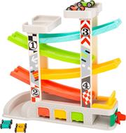 Pronti? VIA! Le 4 macchinine in legno sono pronte per sfrecciare lungo la pista colorata. Dal parcheggio possono partire insieme 2 auto da corsa, al pit stop le auto possono fare rifornimento e nei 3 garage possono essere riposte dopo la corsa....