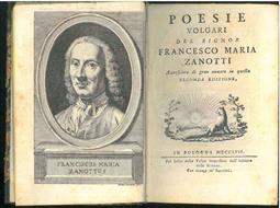 Poesie volgari del signor Francesco Maria Zanotti accresciute di gran numero in questa seconda edizione. Legato assieme: Francisci Mariae Zanotti carmina editio altera priori multo auctior