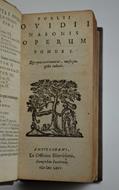 Tre parti in un volume di cm. 11,5, pp. (12) 268 (4b), 292, 309 (1b). ognuna con ulteriore proprio frontespizio e con vignetta incisa. Tomus I Scripta amatoria complexus. Nicolaus Heinsius D. F. infinitis locis castigavit ad fidem scriptorum exemplarium. Tomus II Qui XV Metamorphoseon, sive Transformationum, libros continet. Tomus III In quo Fastorum lib. VI. Tristium V. De Ponto IV. Dirae in Ibin etc. Solida leg. novecentesca in piena pelle, dorso a nervi con filetti e titoli in oro. Esemplare un po' rifilato al margine superiore, peraltro in ottimo stato di conservazione.