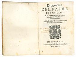 <p>THE FIRST TREATISE ON DOMESTIC ECONOMY AND AGRICOLTURE WRITTEN BY A TUSCAN AUTHOR</p> <p>4to (cm 203x135). [80], 561, [3] pp. Collation: a-k<sup>4</sup> A-Zzz<sup>4</sup> Aaaa<sup>6</sup>. The last leaf is a blank. Printer's device on title page and on l. Aaaa5v. <em>Colophon</em> on l. Aaaa5v. Woodcut historiated initials. Slightly later stiff vellum, inked title on spine (minor restoration to spine, slightly soiled). On title page ownership entry &ldquo;ex codicibus Gabrielis Ritii [&hellip;] et equitis aureati&rdquo;. Some occasional staining and foxing, a few tiny round wormholes to the last fifty leaves, all in all a good, genuine copy.</p> <p>Rare first edition, dedicated to Giulio Pallavicini, of this comprehensive treatise on domestic economy, education of children and agriculture: the first by a Tuscan author.</p> <p>In the preface, Tommasi gives a brief history of the literature on household economy, lamenting the scarcity of texts devoted to the subject: Besides Aristotle, Xenophon and St Thomas, he surprisingly quotes Leon Battista Alberti's then unpublished treatise <em>Della Famiglia</em> (cf. D. Frigo, <em>Il padre di famiglia. Governo della casa e governo civile nella tradizione dell' &ldquo;economica&rdquo; tra Cinque e Seicento</em>, Rome, 1985, p. 17; see also pp. 40-41 and 180-181)</p> <p>The first part of the work deals mainly with family management: marriage, role of women, choice of servants, household government, etc. Christian education is achieved, according to the author who follows the precepts of the Council of Trent, mainly through love for children. Religious instruction, imparted by the father following the different stages of the child's growth (with more authority in the childhood years and then moving to greater depth toward adolescence), must be accompanied by moral instruction, for w