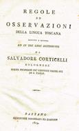 Regole ridotte a metodo ed in tre libri distribuite, pagine con alcune bruniture ai testi e fioriture sparse, tagli non allineati e non rifilati, copertina in cartoncino flessibile, muta, con fioritura ed ingiallita ai margini, dorso ingiallito, con titoli manoscritti e con strappo alla cima. Numero pagine 288