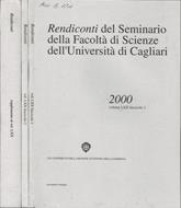 Anno 2000 completo, composto da tre fascicoli, Fascicolo 1, Fascicolo 2 e Supplemento al Volume LXX, rispettivamente di 82, 92 e 426 pagine, Volume LXX del periodico semestrale Rendiconti del Seminario della Facoltà di Scienze dell'Università di Cagliari, direttore: Giovanni Floris. Fascicolo 1 realizzato col contributo della Regione Autonoma della Sardegna. Buono stato, coperta in cartoncino, su piatto anteriore catalogazione bibliotecaria manoscritta, qualche macchia e segni d'uso, tagli appena ambrati, pagine in ottimo stato. Presentano timbro ex biblioteca su frontespizio e sul margine di piede di qualche pagina, cifra manoscritta sul frontespizio del Fascicolo 1, alcune figure in nero ed in b. e n., II tavole fuori formato, ben piegate; su controguardia del Supplemento al Volume LXX presente tasca in carta contenente tre cartine, fuori formato, ben piegate, la prima a colori "Carta Geo-Giacimentologica della Miniera Sa Matta"; la seconda "Carta geologica dei territori dei comuni di Gonnostramatza, Pauli Arbarei, Sanluri, Ussaramanna e Villamar (Marmilla meridionale)", di Sebastiano Barca, Lucia Casu, Alberto Muntoni & Carlo Spano, Dipartimento di Scienze della Terra - Università degli Studi di Cagliari; l'ultima "Carta geologica del settore compreso tra Bonorva e Codrongianus (Sardegna nord-occidentale), di S. Barca, C. Spano, A. Cau, L. Cottone, D. Deidda, G. Sanna. Lingue: Italiano, Inglese, Francese. Numero Pagine 600