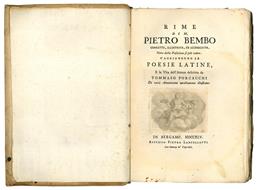 In 8vo (mm 195x128); pp. XXXXVIII, 288. Vignetta calcografica al frontespizio, Iniziale xilografica, testatine tipografiche, finalini xilogrifici e tipografici. A c. O8r iniziano con proprio occhietto "Petri Bembi Carmina". Lievi aloni marginali ad alcune carte, minime mancanze marginali. Cartonato coevo con nervi passanti. Lievi aloni ai piatti, piccole mancanze al dorso.
