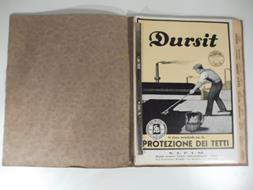 Cartella editoriale con graffe contenente 30 tra fogli, bifoli, opuscoli pubblicitari riguardanti prodotti impermeabilizzanti per l'edilizia, distribuiti da questa ditta. Si tratta di prodotti per l'impermeabilizzazione dei tetti, vernici ignifughe e anticrittogame per la difesa dalle termiti in ambiente tropicale , prodotti per la difesa antiaerea ed antigas, impermeabilizzanti per cemento, manti in juta impermeabilizzanti, vernici protettive nere, bronzalluminio, vernici mimetiche contro incursioni di aereoplani ecc. Vivace grafica anni '30. I prodotti reclamizzati sono Dursit, acquasit, gabrit, dursitect, tex, pagit ecc.