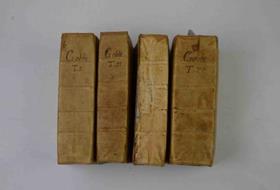Cinque parti in quattro volumi di cm. 15,5, pp. oltre 2.500 ca. complessive. Solida leg. coeva in piena pergamena rigida con nervi passanti. Qualche segno d'uso al dorso del terzo volume, peraltro esemplare, in ottimo stato di conservazione. La prima parte contiene i rimatori dal 1400 fino al 1550, la seconda dal 1550 al 1600 e del 1600, la terza contiene i rimatori viventi del 1709, la quarta divisa in due volumi contiene le aggiunte accresciute in questa quarta edizione. Edizione definitiva e più completa delle precedenti.