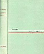 Scritti scelti di Ugo Foscolo a cura di Aldo Camerino: Ultime lettere di Jacopo Ortis e Viaggio sentimentale di Sterne; volume rilegato con copertina in piena tela monocolore, appena sfilacciate le cuffie, deboli impronte da manipolazione in quarta, condizioni buone. Fogli molto ben preservati, tonalità avoriate, tagli abbastanza puliti. Legatura stabile. N. pag. 361.