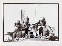 Fotografia in b/n ben contrastata con margini e bordo nero (orientamento orizzontale, cm 31x40,5 ca.) relativa alla IV guerra arabo israeliana (guerra del Kippur),1973. La foto fu pubblicata sulla copertina del n° 330 di "SETTE GIORNI in Italia e nel Mondo". Sul retro timbri neri dell'agenzia e timbro rosso redazionale. Stato buono (sul retro appunti a penna blu, a penna rossa e a pennarello nero - sulla fotografia è stato apposto un foglio di carta lucida fermato al margine superiore dell'immagine con nastro adesivo trasparente ormai ingiallito. Sul foglio lucido ci sono segni e appunti a pennarello nero funzionali all'impaginazione). . 0. . . buono. . .