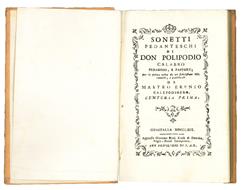 <p>Tre parti in un volume in 8vo (mm. 153x100). Pp. 62, [2]; 61, [3]; 63, [1]. Frontespizi in cornice xilografica. Testatine, iniziali e finalini xilografici. Cartonato arancione coevo, dorso con tassello e titolo in oro. Bellissima copia di grande freschezza.</p> <p>Rara prima edizione, edita per le cure di Ireneo Aff&ograve;, delle rime fidenziane del poeta arcade calabrese Bartolomeo Nappini. Cresciuto a Roma, dove esercit&ograve; dapprima l'avvocatura presso la Camera Apostolica, quindi prese gli ordini e divenne canonico di Santa Maria in Rotonda, fu tra i fondatori dell'Accademia degli Infecondi. In vita pubblic&ograve; solo qualche poesia d'occasione sotto lo pseudonimo di don Polipodio Calabro (cfr. B. Nappini, <em>Rime pedantesche</em>, a cura di P. Crupi, Soveria Mannelli, 2005).</p> <p>&ldquo;Lasci&ograve; la raccolta completa delle sue rime in due codici manoscritti, oggi conservati nella biblioteca Casanatense di Roma (nn. 3941 e 5192). Un'ampia selezione di sonetti &lsquo;fidenziani' in tre centurie fu stampata a Guastalla nel 1769-70 a cura del letterato bussetano Ireneo Aff&ograve; col titolo <em>Sonetti pedanteschi di Don Polipodio Calabro, pedagogo e pastore</em>: poich&eacute; della tiratura rimasero invenduti parecchi esemplari, l'editore Giacomo Beniamino Kross li rimise in commercio dotandoli di un nuovo frontespizio (<em>Rime pedantesche di celebre autor calabrese sopra varj morali, critici, e dilettevoli argomenti secondo il gusto del presente secolo</em>), che falsamente li faceva figurare stampati a Londra nel 1780 a cura di Aristarco Scannabue, cio&egrave; Giuseppe Baretti, in realt&agrave; del tutto ignaro della cosa&rdquo; (S. Franchi, <em>Nappini, Bartolomeo</em>, in: &ldquo;Dizionario Biografico degli Italiani&rdquo;, vol. 77, 2012, s.v.).</p> <p>Ireneo Aff&ograve; nacque a Busseto il 10 dice