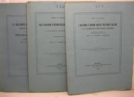 3 fascicoli in 4, pp. 13 + (3b); 15 + (1b); 13 + (1b). Intonsi. Br. ed. Tre estratti dagli Atti dell'Accademia Pontificia de' Nuovi Lincei terza comunicazione - anno XXVII, 5 luglio 1874; quinta comunicazione - anno XXIX, 23 aprile 1876; ottava comunicazione - anno XXXI, 17 febbraio 1878). Gaspare Stanislao Ferrari nacque a Bologna nel 1834, divenne gesuita all'eta' di diociotto anni. Dal 1865 fu assistente di Angelo Secchi all'osservatorio del collegio Romano, per poi assumerne la direzione alla morte di Secchi. In seguito divenne professore di astronomia all'Universita' gregoriana di Roma. Fu autore di una sessantina di lavori di astrofisica pubblicati quasi tutti negli Atti dei Nuovi Lincei.
