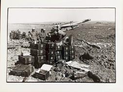 Fotografia in b/n ben contrastata con margini e bordo nero (orientamento orizzontale, cm 31x40,5 ca.) relativa alla IV guerra arabo israeliana (guerra del Kippur),1973. Sul retro timbri neri dell'agenzia. Stato buono (sul retro appunti a pennarello verde, a penna rossa e a matita). . 0. . . buono. . .