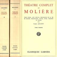 Opera completa in due volumi, tutto il teatro di Moliere in lingua originale, prefazione, cronologia e note a cura di Robert Jouanny. Brossure filo refe in cartoncino flessibile opaco, tonalità leggermente alterate con più evidenza in cornice e al dorso, comuni le mende da scaffale, buono lo stato di conservazione. Fogli di carta finissima, alcuni ancora intonsi, macchie da umido all'angolo del primo tomo, pulviscolo ai tagli non perfettamente ritagliati. Data d'edizione non indicata. Hanno rispettivamente 946 e 918 pagine.
