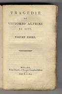 Milano, Pirotta e Maspero, 1801-02, voll. 5, in-8, br. moderna decorata ad imitazione delle carte settecentesche (di buon effetto), titolo manoscritto su tasselli ai dorsi, pp. 323 - (2), 300, (2) - (2), 339 - (2), 356, (2) - (2), 347. Con un ritratto inciso in rame all'antiporta del 1° volume. Esemplari in barbe. Primi 5 tomi dell'edizione delle Opere, che esauriscono le Tragedie (uscirono anche i voll. 6 e 7: “Opere varie”). Esemplare interessato da numerose tracce di tarlo.