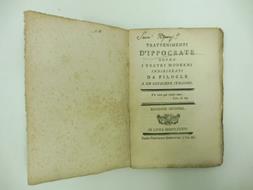 In 16, pp. 144. Lieve mancanza al dorso. Due tarletti alle prime 50 cc. uno nel margine superiore bianco, uno fra l'interlinea di testo con sporadica lesione di qualche lettera. Bella bross. decorata coeva. Seconda edizione di questo saggio di critica che riprende le secolari accuse rivolte al teatro da parte della Chiesa. Il teatro falsifica e mistifica la realta'. Lo scritto risente ancora nella terminologia e nell'impostazione filosofica della teoria delle passioni di ascendenza secentesca.