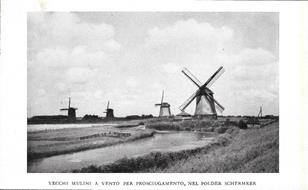 Vecchi mulini a vento per prosciugamento nel polder Schermeer. Stampa 1934