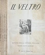 Volumi nn. 1-4, anno IX, 1965 della rivista Il Veltro. Copertine brunite e macchiate ai piatti e al dorso, stanche agli angoli e alle estremità del dorso. Pagine ben salde alla cerniera, con ampio margine, brunite, così come i tagli. Presente fioritura ai tagli. Numero pagine consecutivo con gli altri volumi. Numero pagine 532.