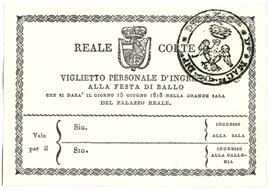Viglietto personale d'ingresso alla festa di ballo che si darà il giorno 15 giugno 1818 nella grande sala del Palazzo Reale