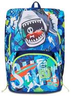 Sagomatura anatomica degli spallacci, imbottiti e rivestiti in tessuto e rete; Zaino estensibile tramite zip laterali, la bocca dello squalo si apre e si chiude tramite sistema ad aria da singolo spallaccio a pressione. Fantasia allover e stampa posizionata. Tasca in rete portaborraccia. Etichetta in gomma personalizzata con logo SJ.